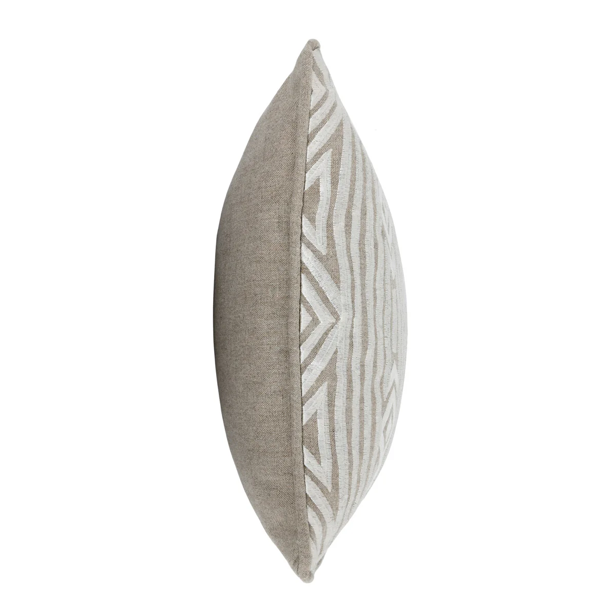Energetic yet versatile, this pillow features an embroidered tribal design atop a natural-hued background. Understated texture and a subtle sheen add dimension while a piped edge neatly frames the look. Neutral tones complement any color scheme.