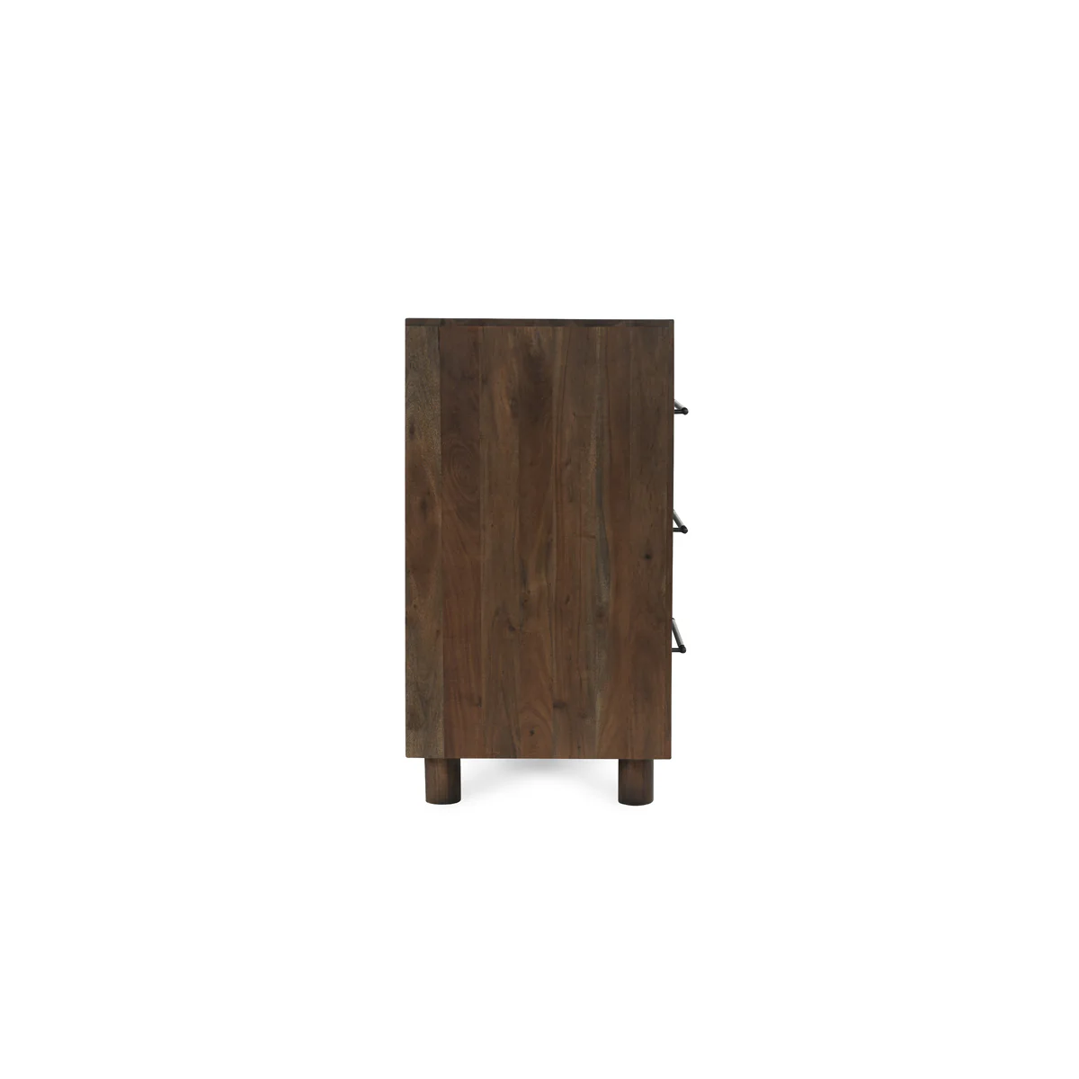 Crafted from sustainable acacia wood, this nightstand offers a simple, streamlined design and rich organic hues that suit any style and color palette. Nine drawers offer versatile storage space, while a wide metal bar pull offers ease of use. Thick, stocky tube legs complete the look with a subtle retro element and added visual appeal.