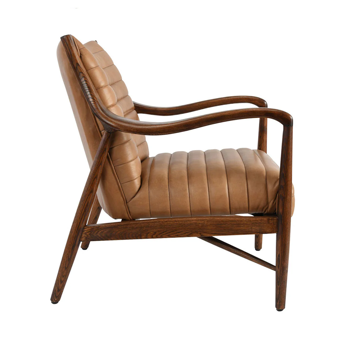 Elevated by channel-stitching, the Kenneth Club Chair in tan is composed of high-quality top grain leather. Its tan upholstery seamlessly blends into a beautifully composed ash wood frame, boasting vintage appeal with sleek, tapered legs.