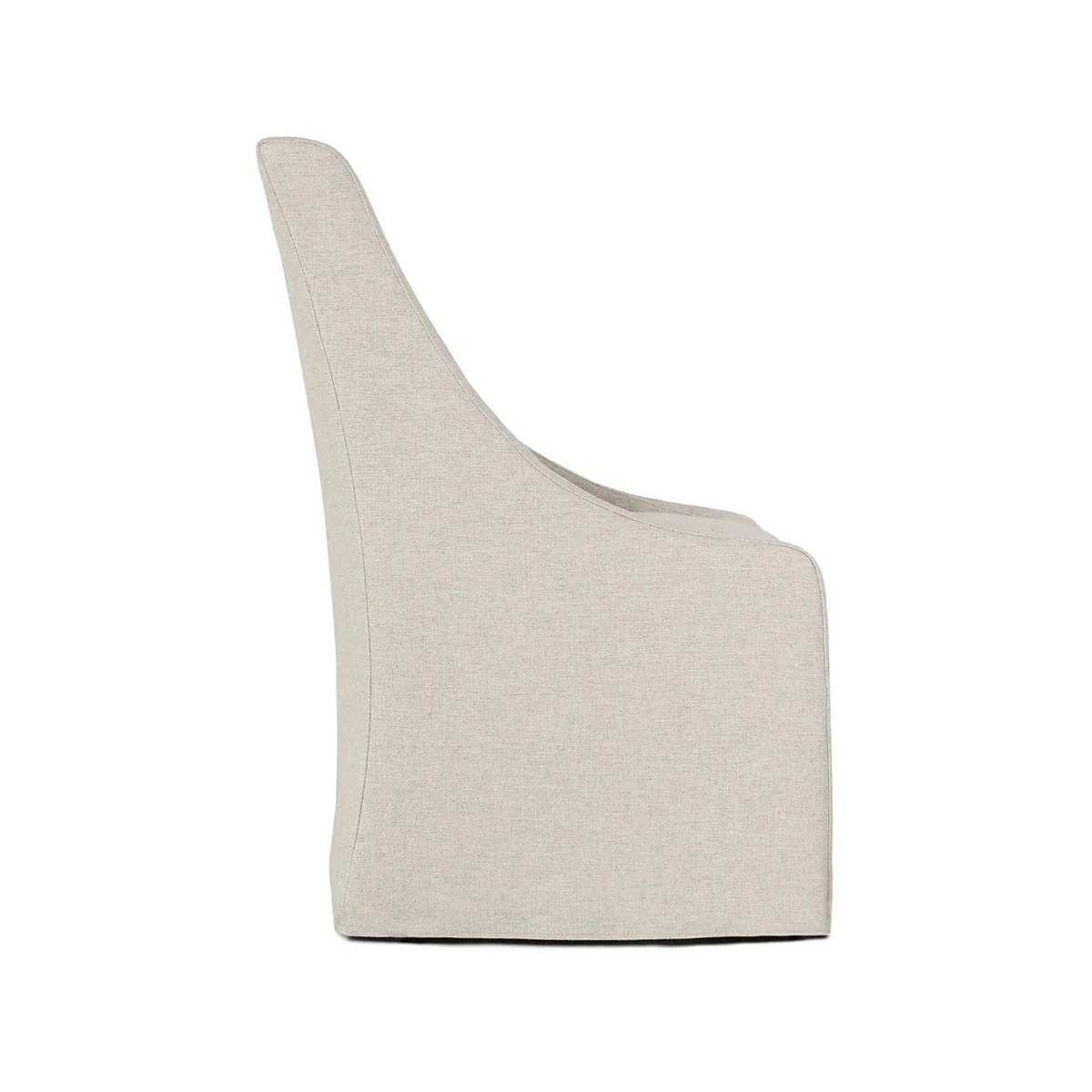 This classic dining chair elegantly marries form and function with its sloping arms, adding a graceful curve that comfortably cradles the body. Equipped with castors for effortless mobility around your dining table, its neutral gray upholstery effortlessly complements any color palette, enriching your dining experience.